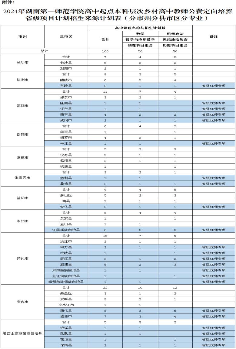 附件:1. 2024年2138cc太阳集团官网入口高中起点本科层次乡村高中教师公费定向培养省级项目计划招生来源计划表(分市州分县市区分专业)