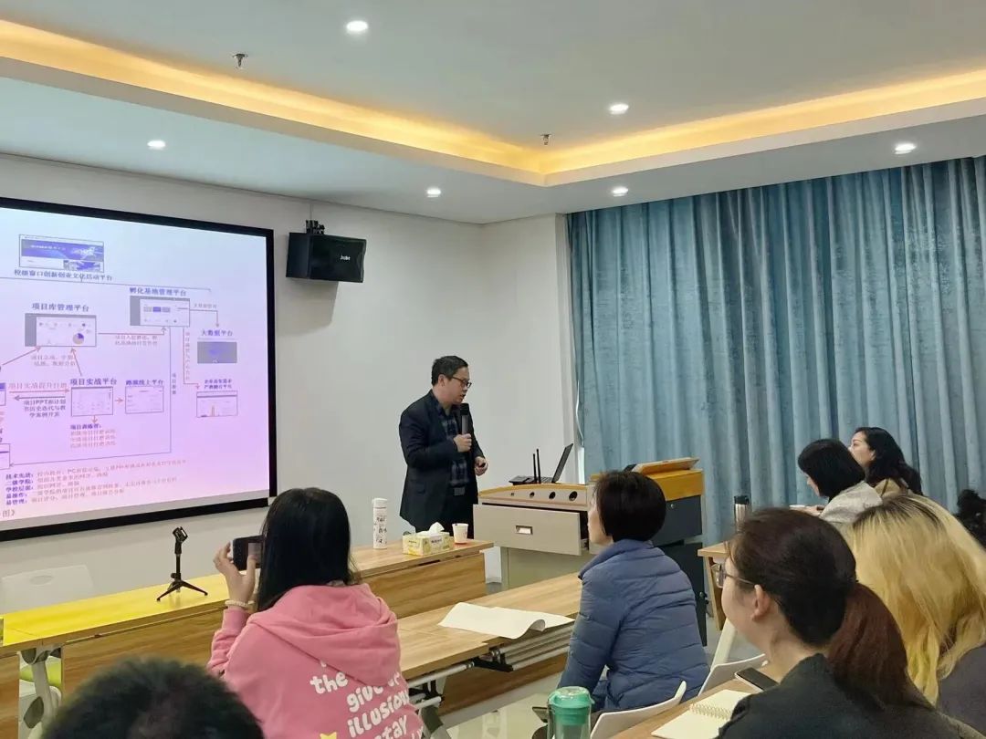 会议伊始,殷章馨以“跨界,成长,话赛事”为主题,简单介绍了老员工创新创业三大权威赛事及省级和国家层面的相关高校创业赛事。紧接着尹青军老师从创新创业内源精神、“互联网+”赛道组成、赛道规则,商业模式等几个方面进行了深度剖析,重点强调了赛事期间该如何进行准备,并从员工定位、导师定位、项目人员组成、项目完整度给出了合理化的建议。