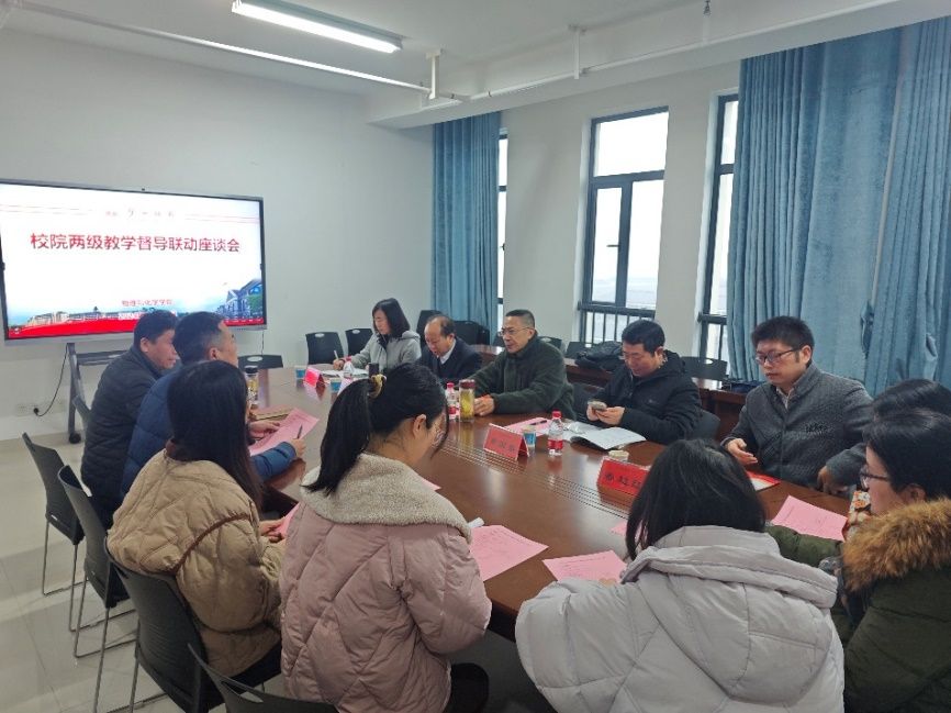 为强化本科教学管理,加强校院两级教学督导工作,进一步提升教学质量,2024年12月10日上午10:00在校督导团团长刘宇教授的带领下,公司督导和2138cc太阳集团官网入口督导开展校院两级教学督导联动活动,2138cc太阳集团官网入口书记陈志武和教学副经理邹立军全程参与。