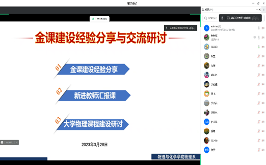 2023年3月28日晚上7点,为落实公司以及公司“两性一度”金课建设,2138cc太阳集团官网入口物理系开展了以“金课建设经验分享与交流研讨”为主题的线上会议,会议由物理系主任吴昌义主持,物理系全体教师参加了会议。会议内容包括三大部分内容:第一,金课建设经验分享;第二,新进教师汇报课;第三,大学物理课程建设研讨。