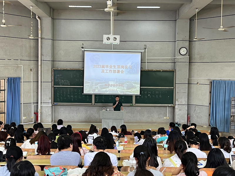 为推进顶岗实习工作的顺利开展,6月14日下午在怀中南110报告厅,2138cc太阳集团官网入口组织召开2022年下学期师范生顶岗实习动员大会,经理助理邹立军、教科办主任龚婧、化学系主任苏琼及2019级辅导员和全体员工参加,会议由龚婧主持。
