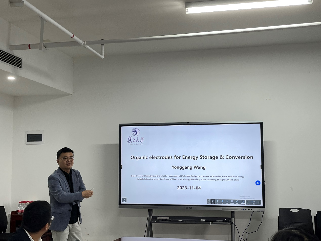 王永刚教授以“有机物电极在电化学能量存储与转化中的应用”为题,分析了研究有机物电极的原因,进一步指出可以通过设计有机物分子结构合成,实现可持续发展。然后,王教授具体介绍了Li+/Na+、Mg2+/Zn2+金属阳离子和质子的可逆储存所涉及的界面电化学,并利用这些储能机制和相应的界面特性,发展出一系列具有超长寿命且环保低毒的水系有机物电池,能够在超低温条件下工作的电池体系,以及基于有机物电极质子缓存机制的分步-无膜电解水技术。王教授生动形象的报告,引起了师生的热烈讨论。