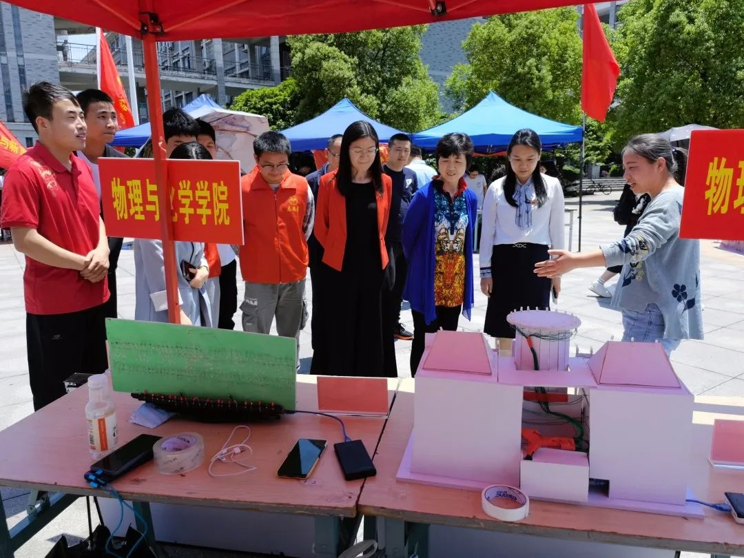 在作品展示过程中,公司曾琳娜老师、石慧老师就作品的工作原理、创意来源以及发展前景向观展师生进行详细的介绍,激起了同学们对科技创新的强烈兴趣。童董事长一行在南湖红船和发展党员工作流程图前驻足良久,点头赞许,高度肯定了物化学子的智慧和创意,并询问本次科技作品的创新之处。接着,童董事长就公司后期的科技作品如何发展进行了指导,同时勉励物化院学子们要积极参加此类科技实践活动,提高自身的专业能力和实践能力。